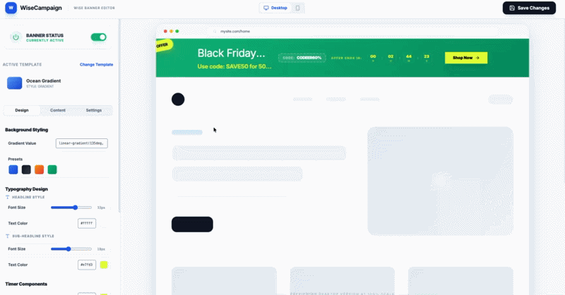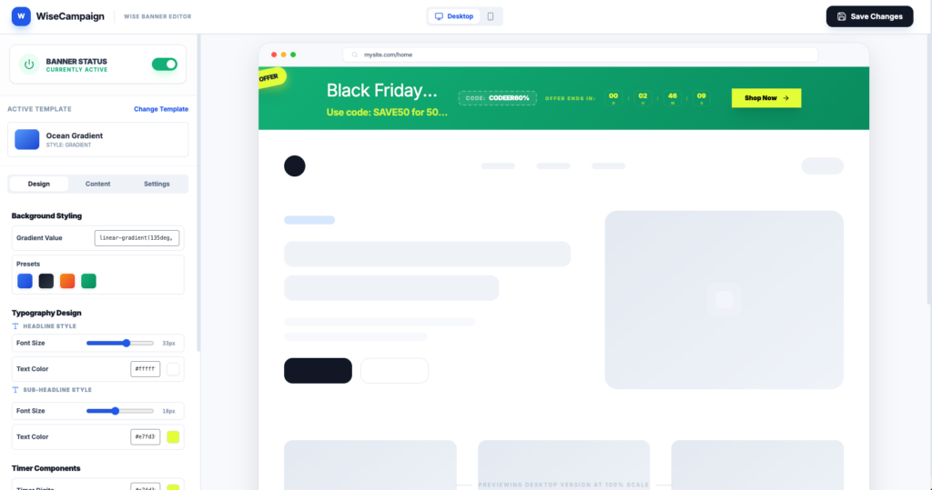 wiseCampaign is a powerful WooCommerce marketing plugin that helps store owners boost sales with countdown banners, stock urgency bars, direct checkout, sales notifications and advanced discount rules – all from one simple dashboard. No coding required.