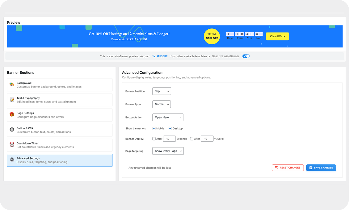wiseBanner is a built-in feature of the wiseCampaign plugin that lets you create beautiful top bar banners with countdown timers. You can announce sales, promote special offers, or display messages at the top of your website all with easy customization and no coding required.
